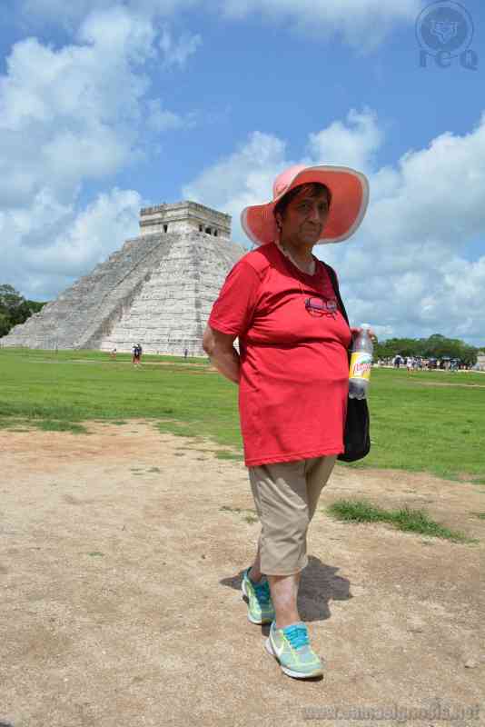 Entrañable compañera enmarcada por la portentosa pirámide. A pesar que la caminata fue larga y cansada nuestra compañera no se venció.