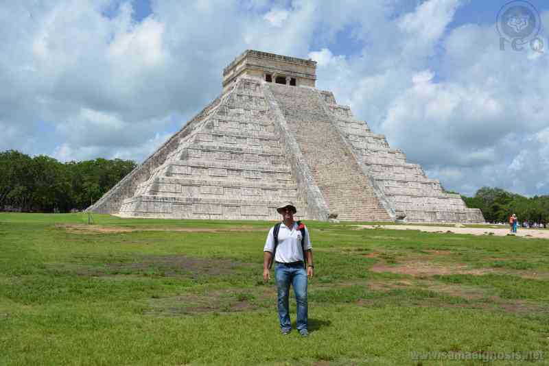 Un cielo azul y nubes vaporosas que coronan la pirámide de Kukulcán mientras uno de los instructores posa. Después de haber cumplido con su cometido el Instructor Ricardo Santana de Phoenix posa al pie de la pirámide de Kukulkán.
